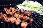Thread pork on skewers. Grill outdoors over hot barbecue grill or indoor or heavy grill pan sprayed with mesquite spray, turning once, until both sides are browned and cooked through, about 5 minutes. Sprinkle with green onion and sesame seeds. Serve with lime wedges and Tomato Salsa.